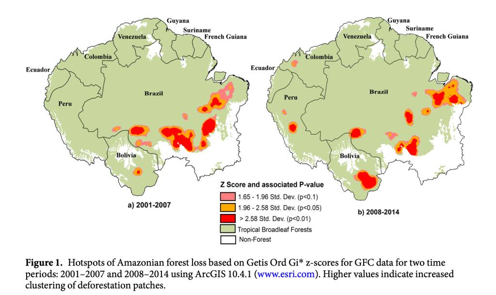 The Bolivian hotspot expanded rapidly from covering an area of ~300km2 in 2001-2007 to an area of ~9560 km2 in 2008-2014, thus representing the largest deforestation hotspot (at 99% confdence levels) over the Amazon during that period.