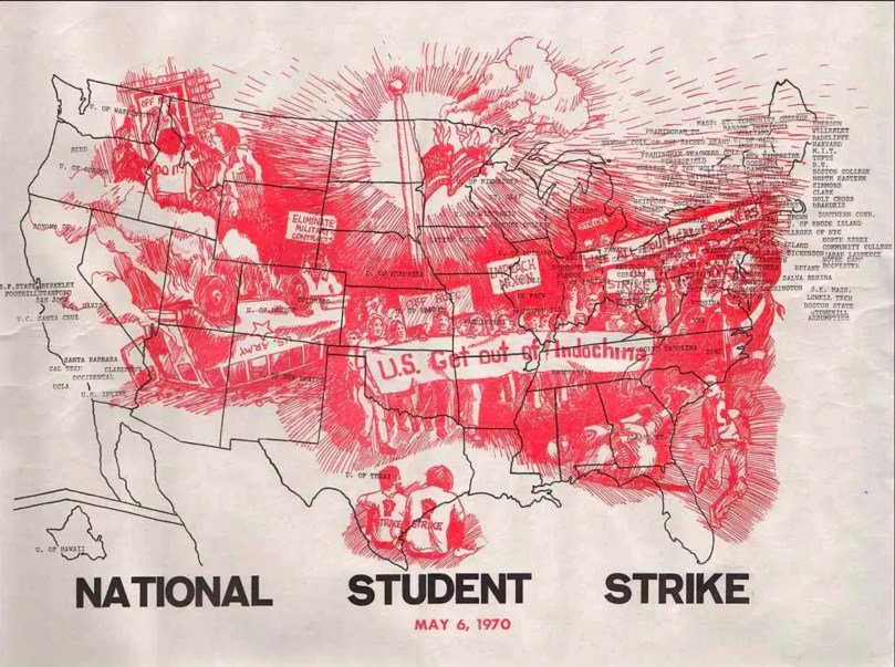 May 1970: At the end of April 1970, the Nixon administration announced its invasion of the neutral country of Cambodia, a major expansion of the already reviled Vietnam War. This escalation coincided with a national student strike designed to protest the war, militarization on campus, and repression of the Black Panther Party. Fatal shootings of 4 students by the National Guard at Kent State (Ohio), 2 students by police at Jackson State (Mississippi), and six Black men in Augusta (Georgia) escalated national protests. Meanwhile, a wildcat teamster strike paralyzed trucking on the heels of March postal strike, the largest wildcat strike in American history. New York City artists organized a Strike against Racism, Sexism, Repression, and War. A University of Washington mapping project estimates that over a million students went on strike at 883 campuses. George Katsiaficas offers higher estimates in The Imagination of the New Left, including that as many as one half of college students participated in the strike, that 35,000 National Guardsman were activated for domestic duty, that over 2,000 people were arrested, that over 100 people were killed and wounded by state forces, and that 16,995 on-campus incidents of arsons or bombings set a historical record for property destruction.
