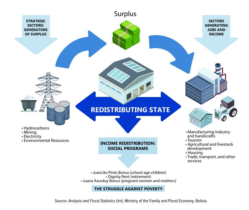 Arce built an economic model of fiscally responsible left populism on the foundation of the partial nationalization of resource rents, principally natural gas exports, and high commodity prices. His “Social, communitarian productive economic model” positioned the government as the redistributor of profits from the extractive sector to “sectors that generate income and employment,” such as manufacturing and public services.