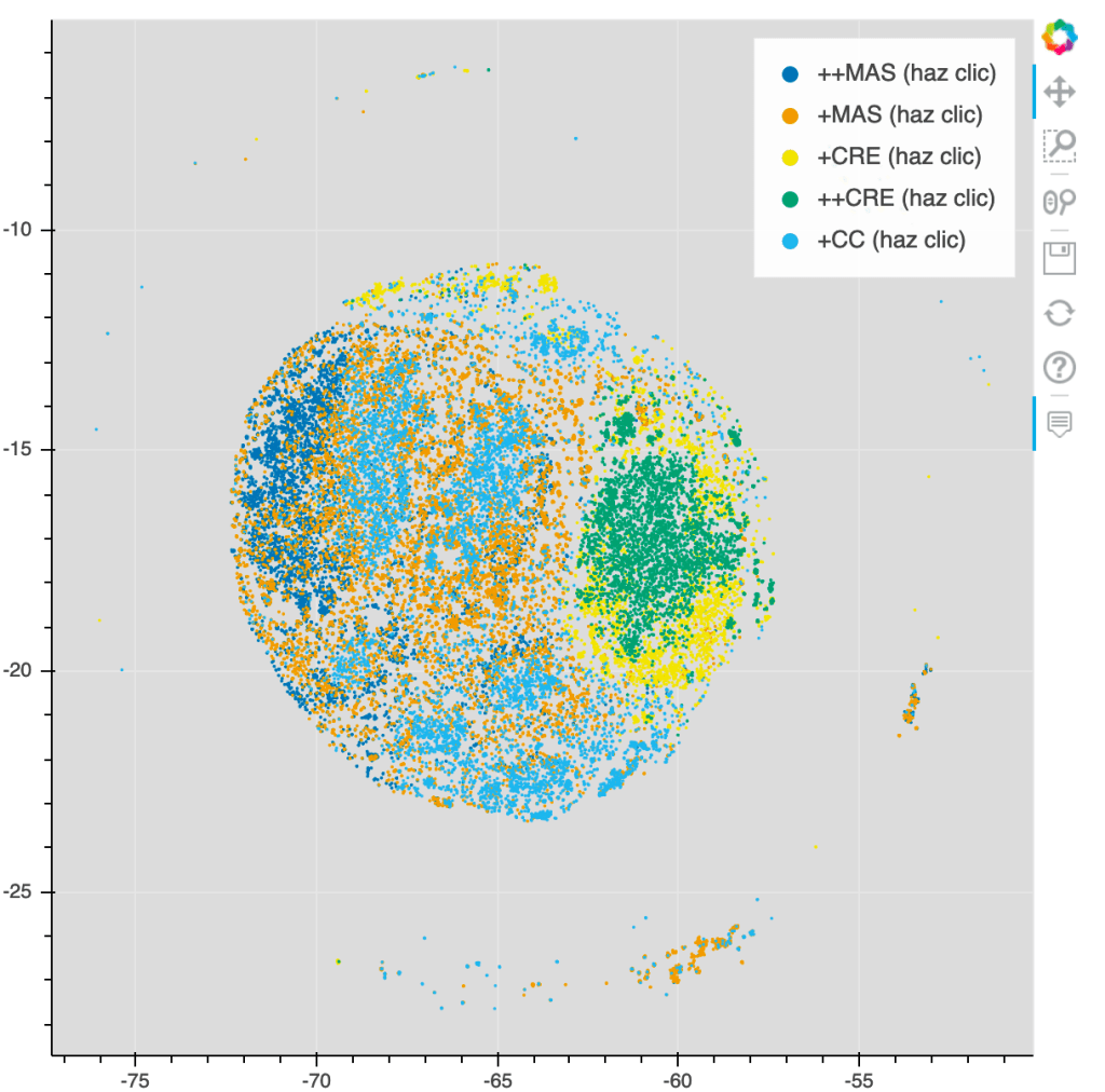 But I wanted to know how many voters went each way, so I dug into Aliaga et al.’s cluster analysis which breaks down voting tables into five clusters, based on their 2019-to-2020 shifts. You can see the clusters geographically on this cartogram (which enormously magnifies cities and shrinks rural areas). Metro Santa Cruz is the yellow and green ++CRE and +CRE patches The highland cities are +CC light blue El Alto & the Altiplano are ++MAS dark blue Much of rural Bolivia is +MAS orange. (A helpful tool for wrapping your brain around this cartogram is the side-by-side map here.)
