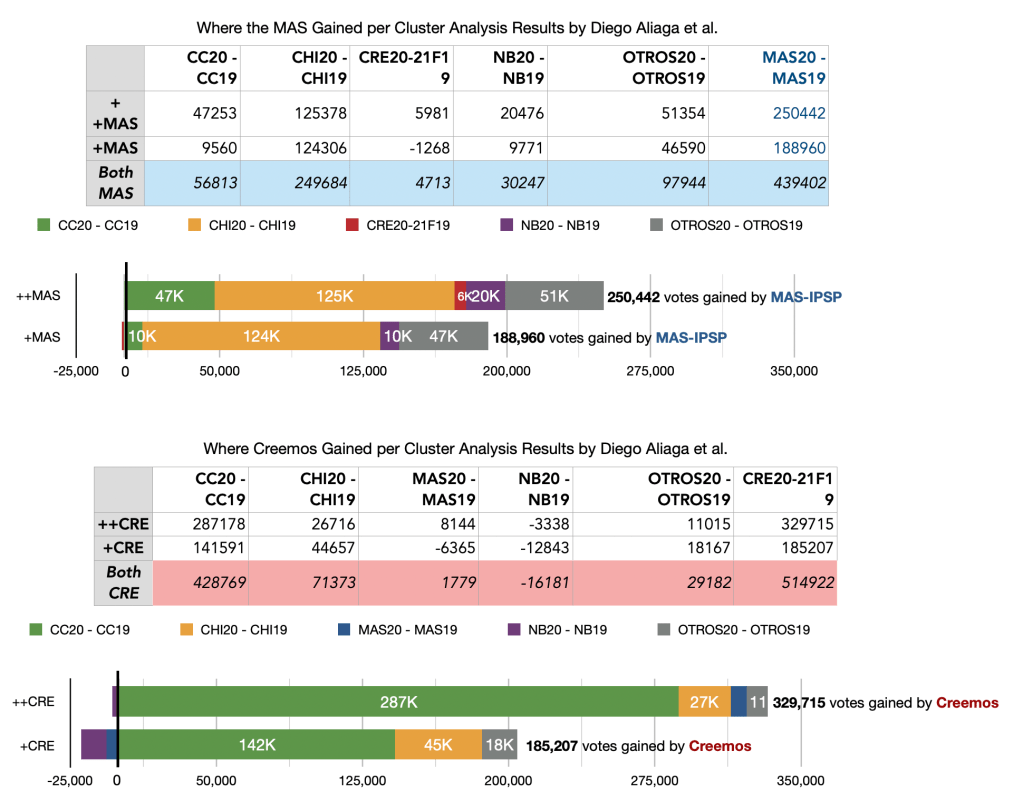 By looking at the vote shifts in these five clusters, we can see exactly how votes got from the vote-losing parties to the MAS and Creemos. The net result: