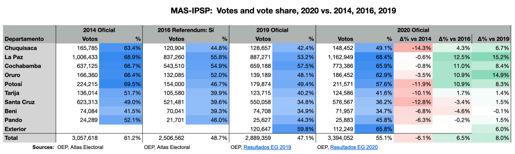 Where MAS vote shares were tightly clustered in the high 60s in these four departments plus Chuquisaca as recently as 2014, it suffered 20%+ vote losses in Potosí and Chiquisaca in the 2016 referendum. In 2020, MAS support in these two departments remained well below its 2014 levels, while the party had nearly recovered its vote share in La Paz, Oruro, and Cochabamba. Elsewhere in the four departments known as the media luna (crescent moon), Arce and Choquehuanca were unable to recover more than 2% of voters.