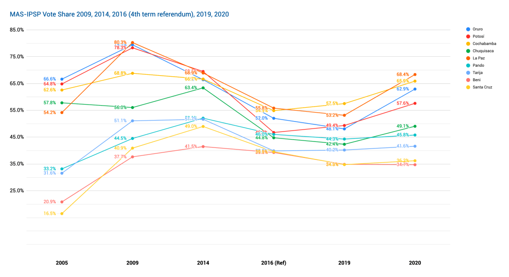 Given its much larger population, La Paz department—and really the twin cities of La Paz and El Alto—have become the critical swing region between the MAS and its opponents. The defection of many in La Paz and El Alto from the coalition in 2016, 2019 was decisive, as was their return in 2020.