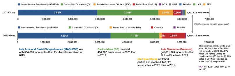I draw on a statistical analysis of votes shifts by Diego Aliaga and colleagues, municipality-level vote analysis by Arián Laguna, citing and sometimes questioning their conclusions, and vote data from the Plurinational Election Organ (2019|2020). The analysis from 2019 to 2020 is simplified by the fact that nearly equal numbers of valid votes were cast in the two elections, meaning that we can work with raw vote counts as well as vote shares.