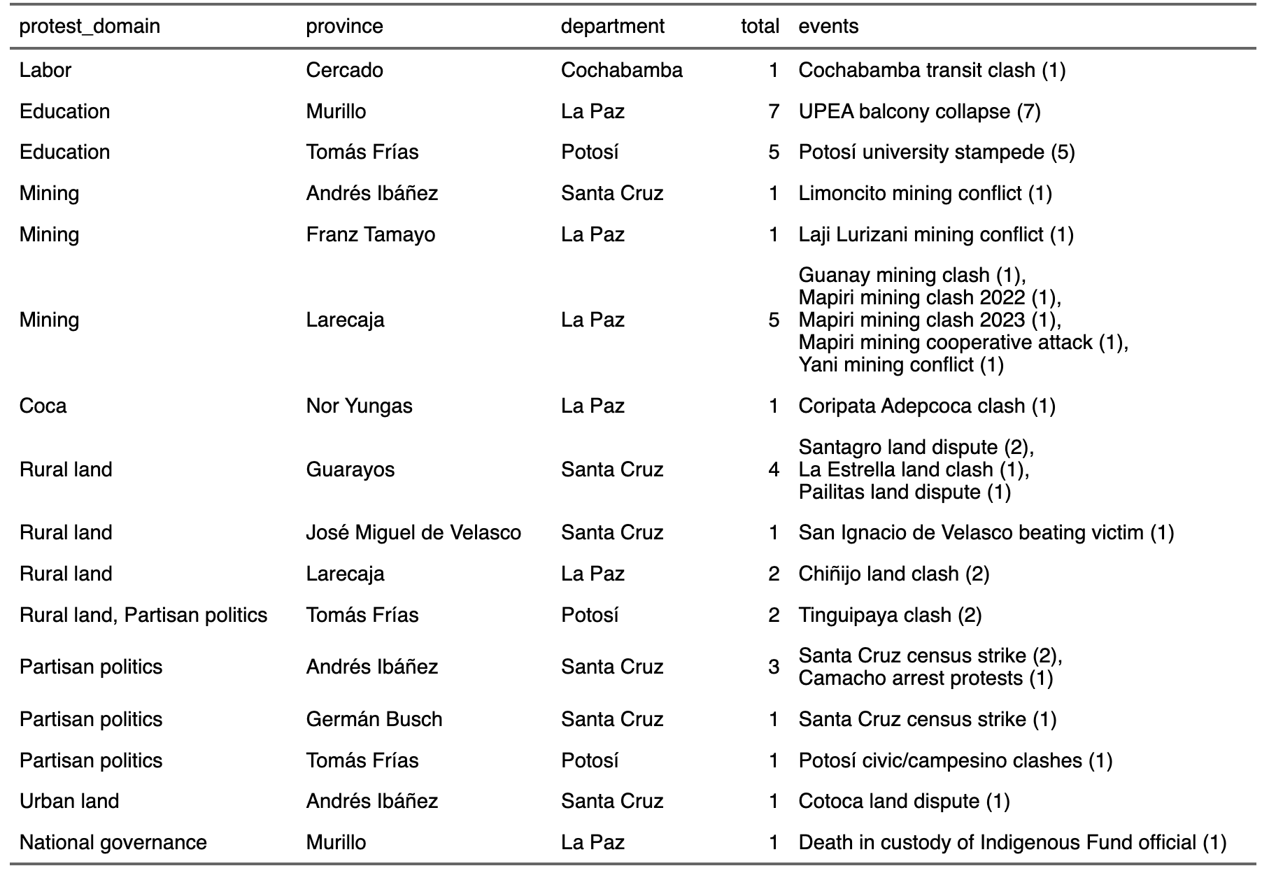 Eleven people have died in social movement-related violence in Bolivia since the beginning of 2023, ten of them the victims of violence carried out by other social groups. These conflicts pitted rural community members against miners, as well as disputes within the same profession, be it mining cooperatives, urban transit drivers, or rival claimants to rural land. Only one death, in January 2023, was caused by security forces, who fired a projectile into the eye of a bystander during raucous protests over the arrest of right-wing governor Luis Fernando Camacho.