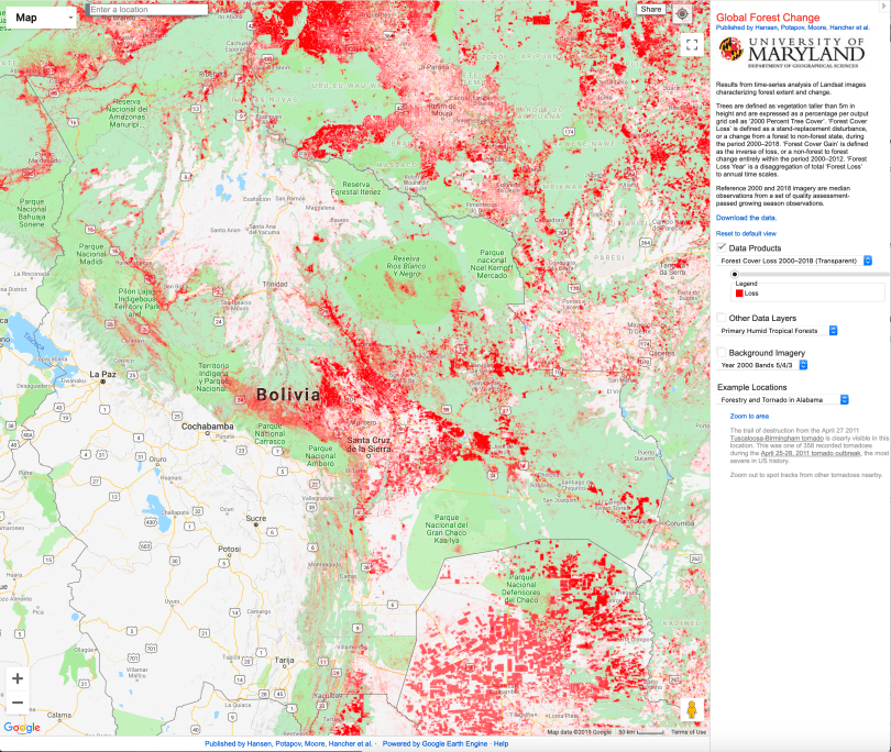 The image above, produced by the University of Maryland’s Global Forest Change explorer, shows the loss of forest in Bolivia and surrounding countries from 2000 to 2018. As the fires continue to burn in Bolivia’s Chiquitano dry forest in Santa Cruz department, as well as in Beni, Pando, and Cochabamba departments, it’s important to take a longer look at the problem of deforestation in Bolivia. This post discusses its scale, hot spots, and how the current trend will break Bolivia’s climate pledges to the international community.