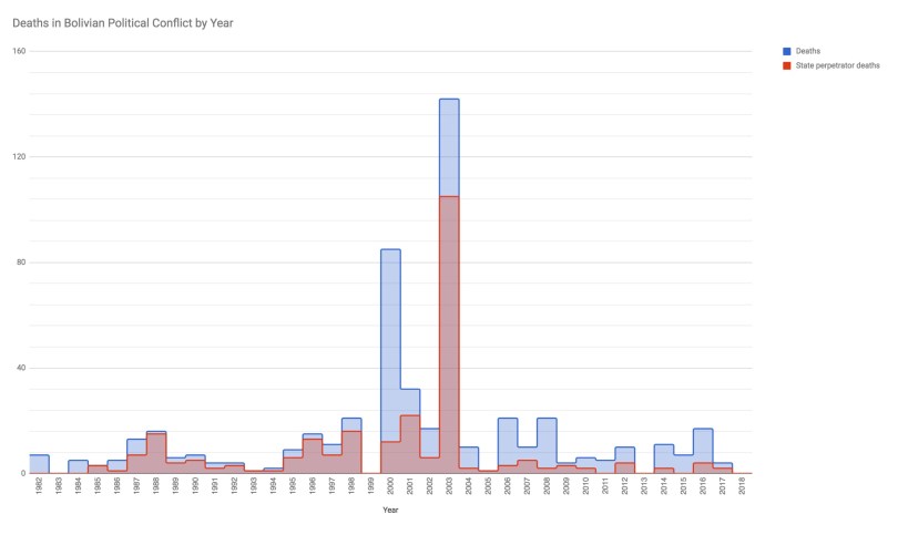 Hemos trabajado para construir una base de datos de las aproximadamente 500 muertes en el conflicto político boliviano desde 1982, codificadas según movimiento, campaña de protesta, causa de muerte, partidos responsables y geografía. Será una nueva herramienta para los científicos sociales, historiadores orales y defensores de los derechos humanos a utilizar en el futuro próximo.