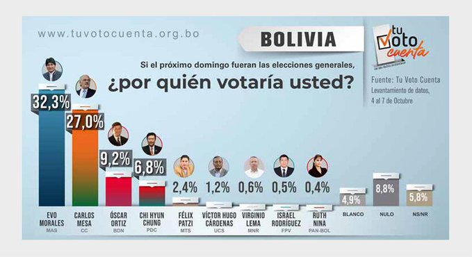 If accurate, Morales’ 32.3-27.0 margin would neither clear the 40% threshold nor the 10% minimum difference, even after excluding blank, null, and unsure votes as the electoral authorities will do in their calculations. Another poll by CiesMori shows a wider lead, 36.2-26.9. Discarding the neutral votes, this puts Morales just above the numbers needed to avoid a runoff.